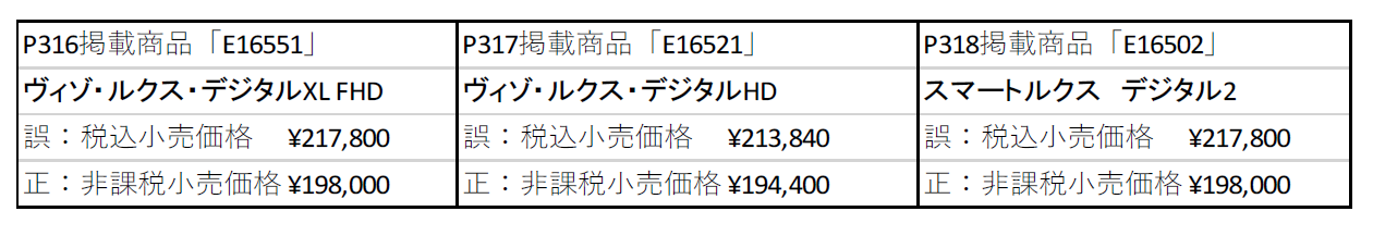 また、サンニシムラ新総合カタログ(2025-2027)におきまして、エッシェンバッハ拡大読書器の小売価格に一部誤記がございましたので、