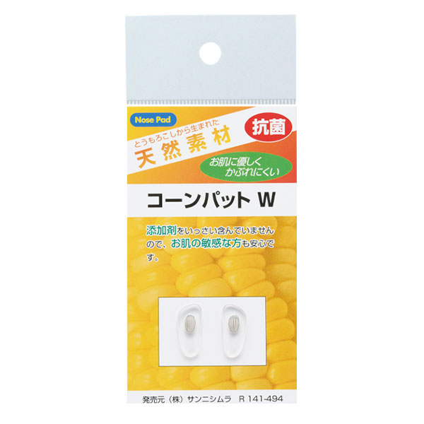 カスタマイズ Rシリーズ(つり下げ販売シリーズ) コーンパット トウモロコシを使用した肌にも環境にも優しいパット 特徴・機能 コーンパットの特徴 トウモロコシを利用した天然素材 トウモロコシから作られたバイオマスプラスチック製のパット。 可塑剤によって肌が荒れやすい方にオススメです。 【R141-493】 【R141-494】 品番 パット素材 蝶芯カラー 蝶芯素材 長さ(㎜) 最大巾(㎜) ネジ穴径(㎜) R141-493 トウモロコシ G 金属 17.5 7.5 1.2 R141-494 トウモロコシ W 金属 17.5 7.5 1.2 関連製品 品番 製品詳細に表記 コーンチタンパット 品番 製品詳細に表記 チタンパット 品番 製品詳細に表記 チタンメタルパット 製品情報一覧へ戻る