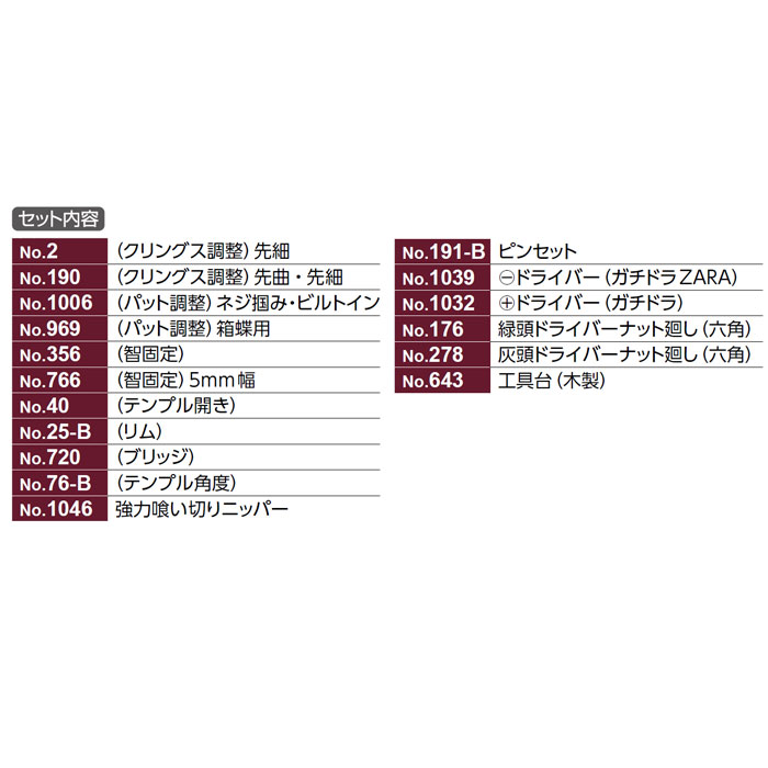 - 1本で幅広いネジ径を対応できるガチドラや、様々な形状のクリングス・パットに対応するマルチヤットコを採用。 最小限でも調整できるように、厳選した工具をピックアップしました。