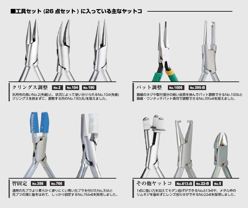 - 使いやすいヤットコや、用途が分かりやすいヤットコを中心に揃えました。 新店オープンで悩んだ際に、揃えておくと安心のセットです。